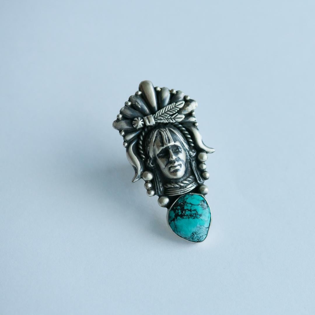 ネイティブアメリカンの顔が力強く彫刻され、細部まで丹念に仕上げられた存在感あふれる作品です。