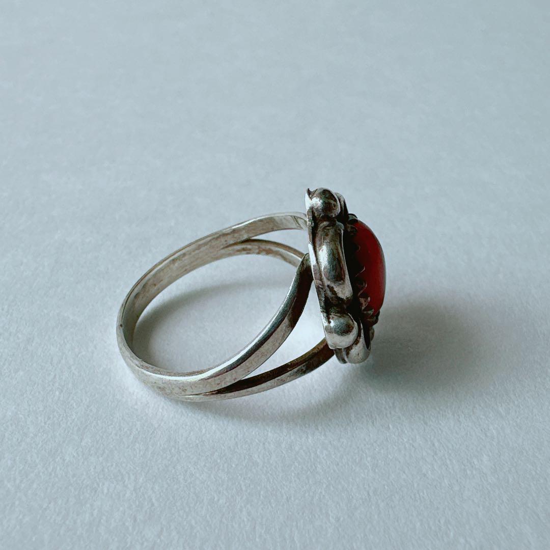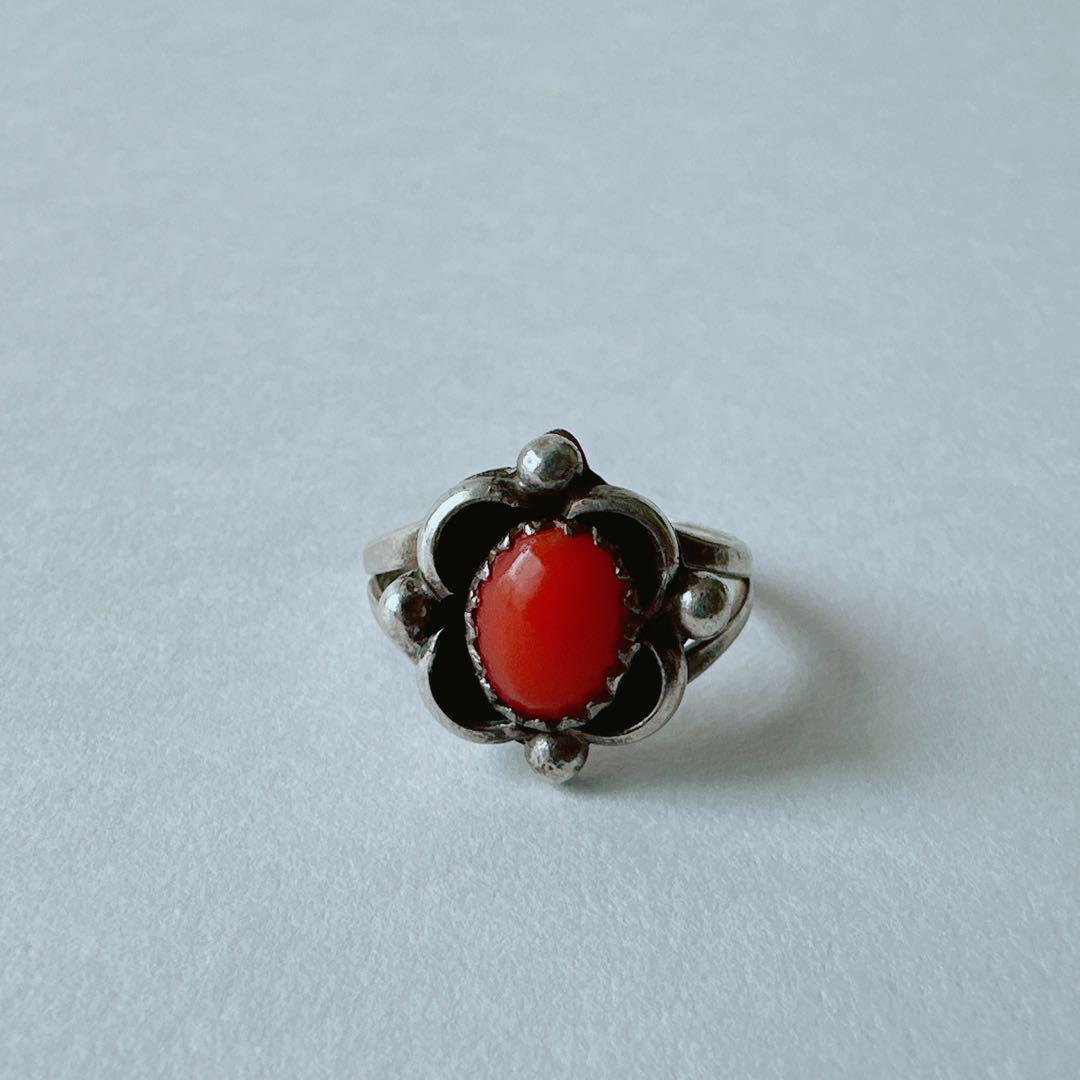 鮮やかなレッドコーラルをセットした、ナバホ族によるスターリングシルバーリングです。温かみのある赤色は、視線を引き寄せます。