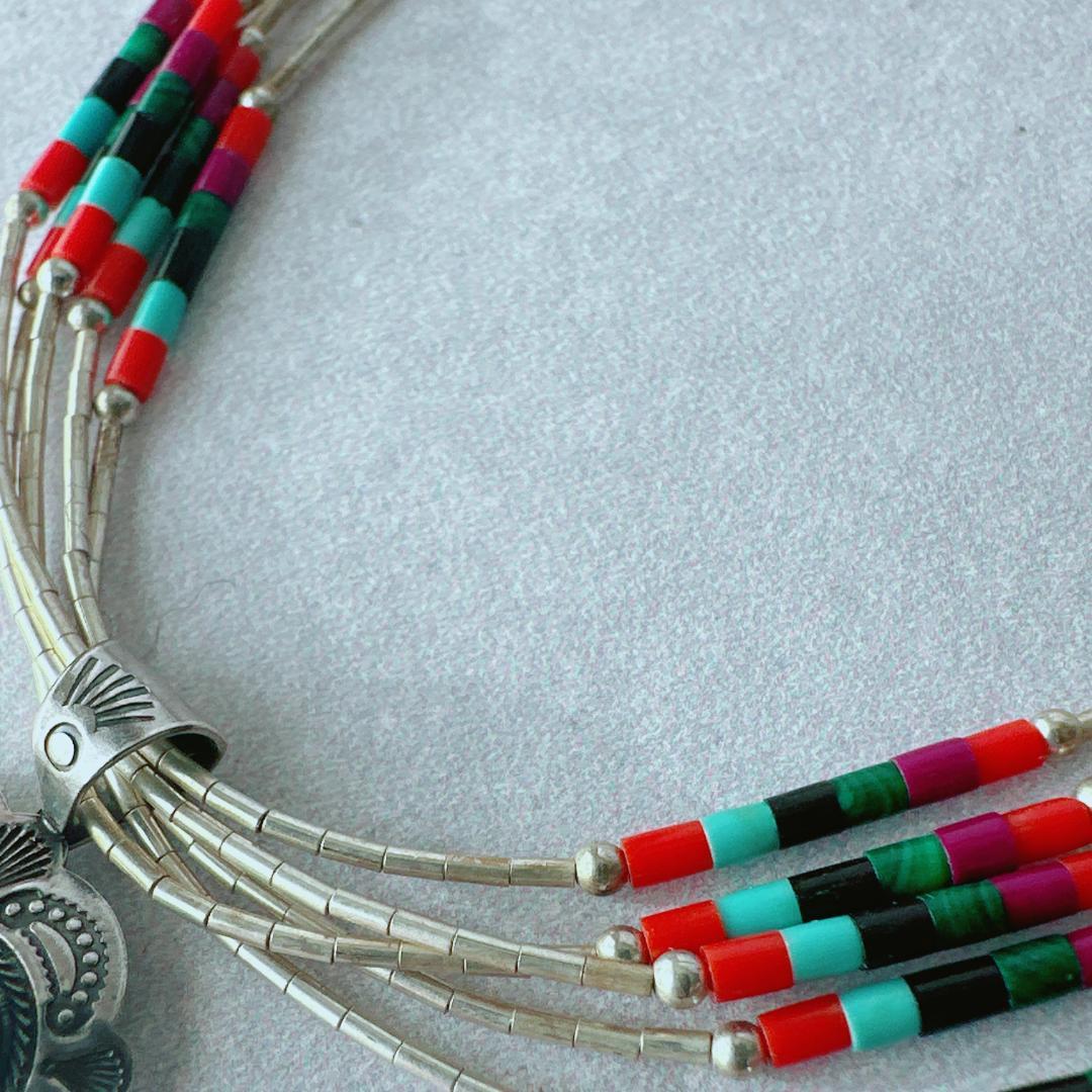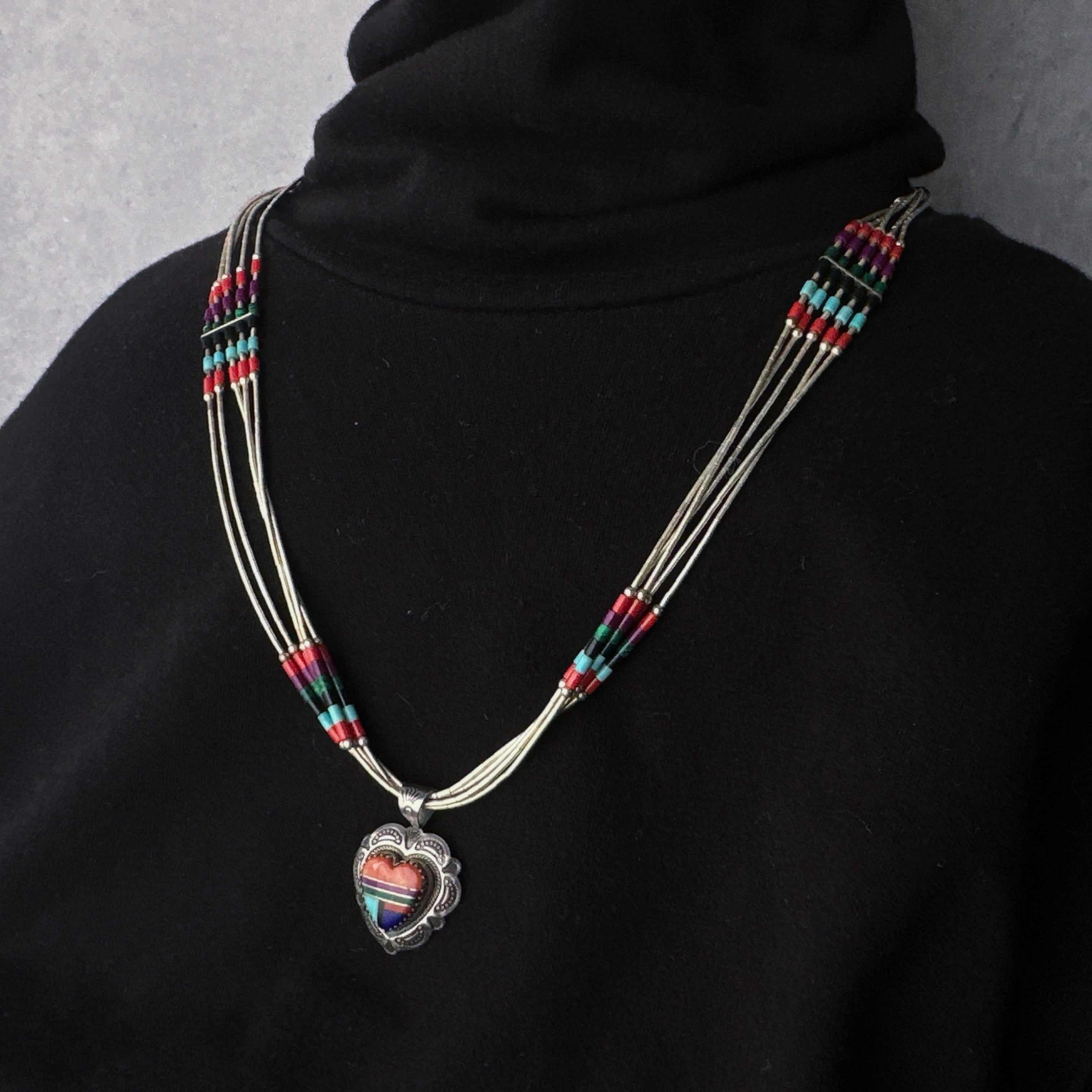 立体的なハートのトップに、ターコイズ・コーラル・マラカイトなどを細密に組み合わせたインレイワークが施された、存在感あふれる一点です。