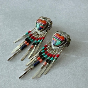 鮮やかなターコイズ・コーラル・オニキスなどを組み合わせた精巧なインレイ、ハート型の立体フレーム、揺れるフリンジが印象的なエレガントなデザイン