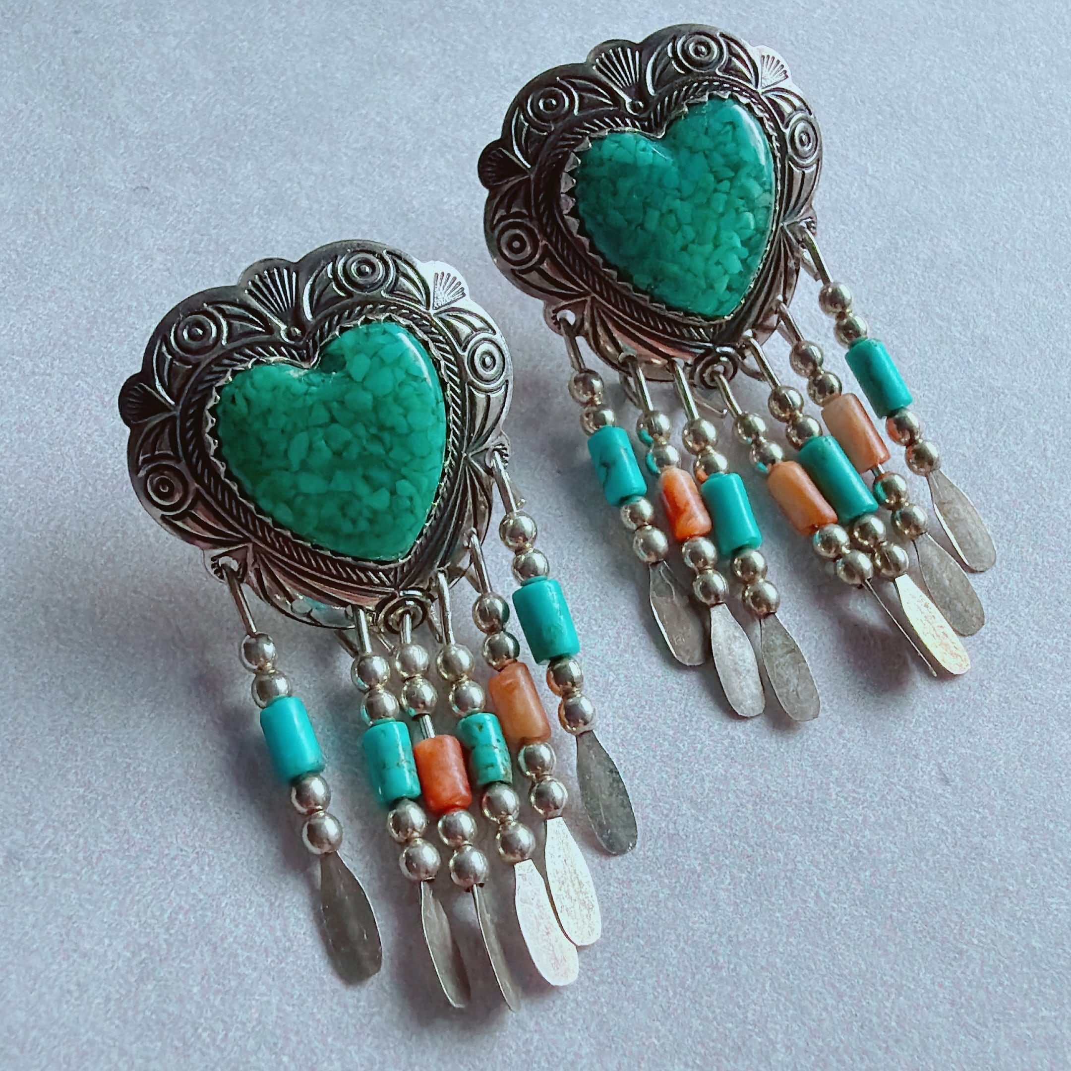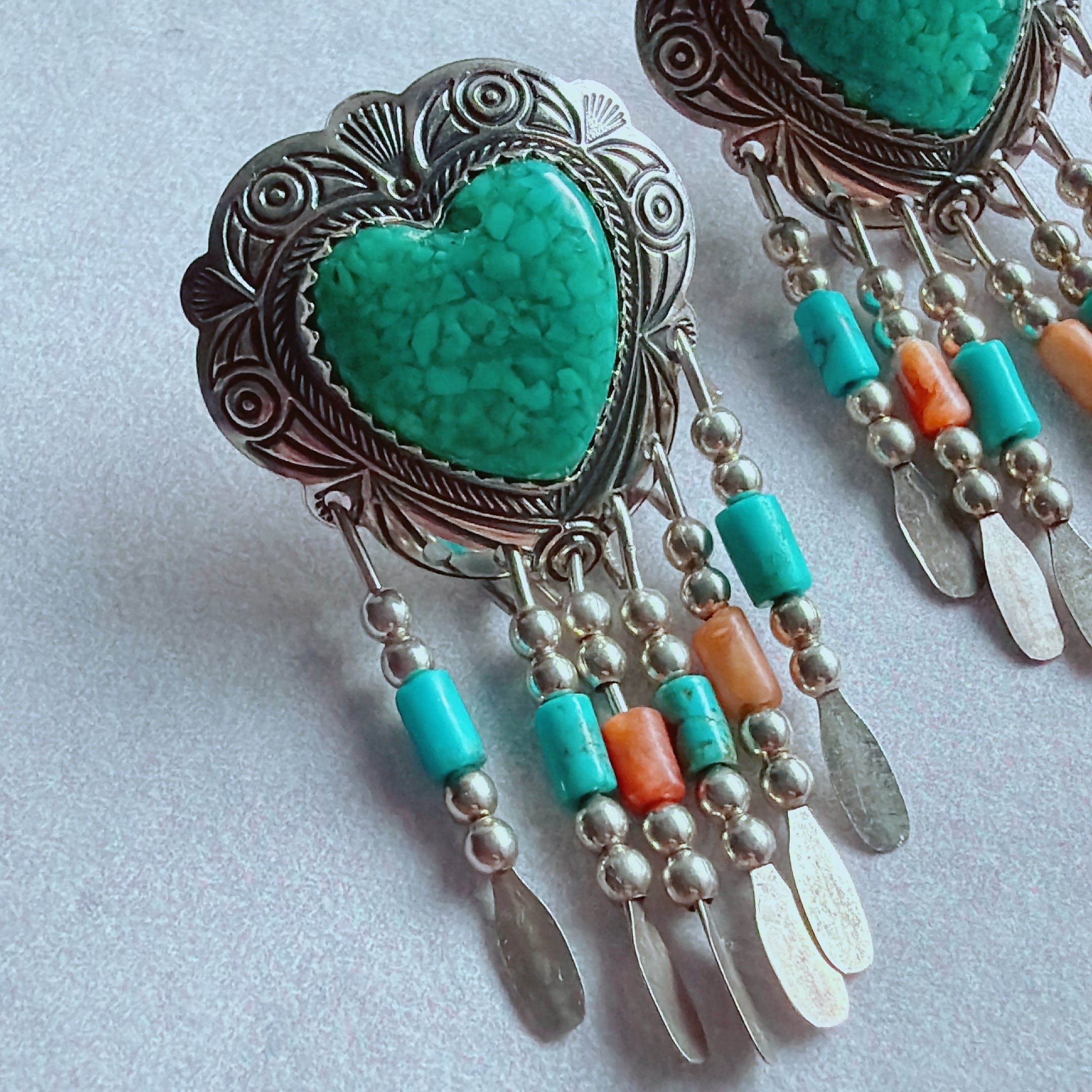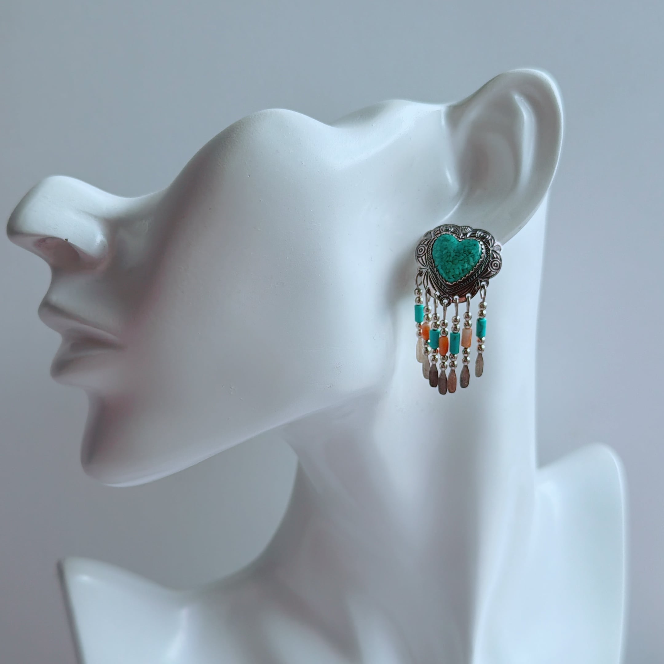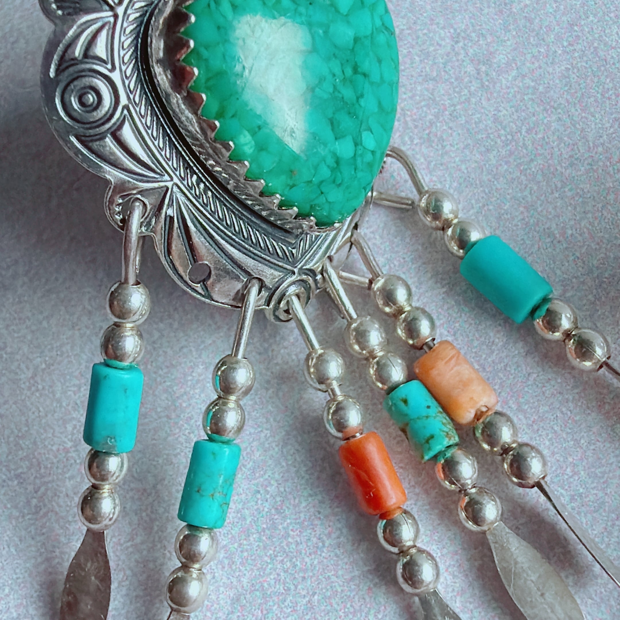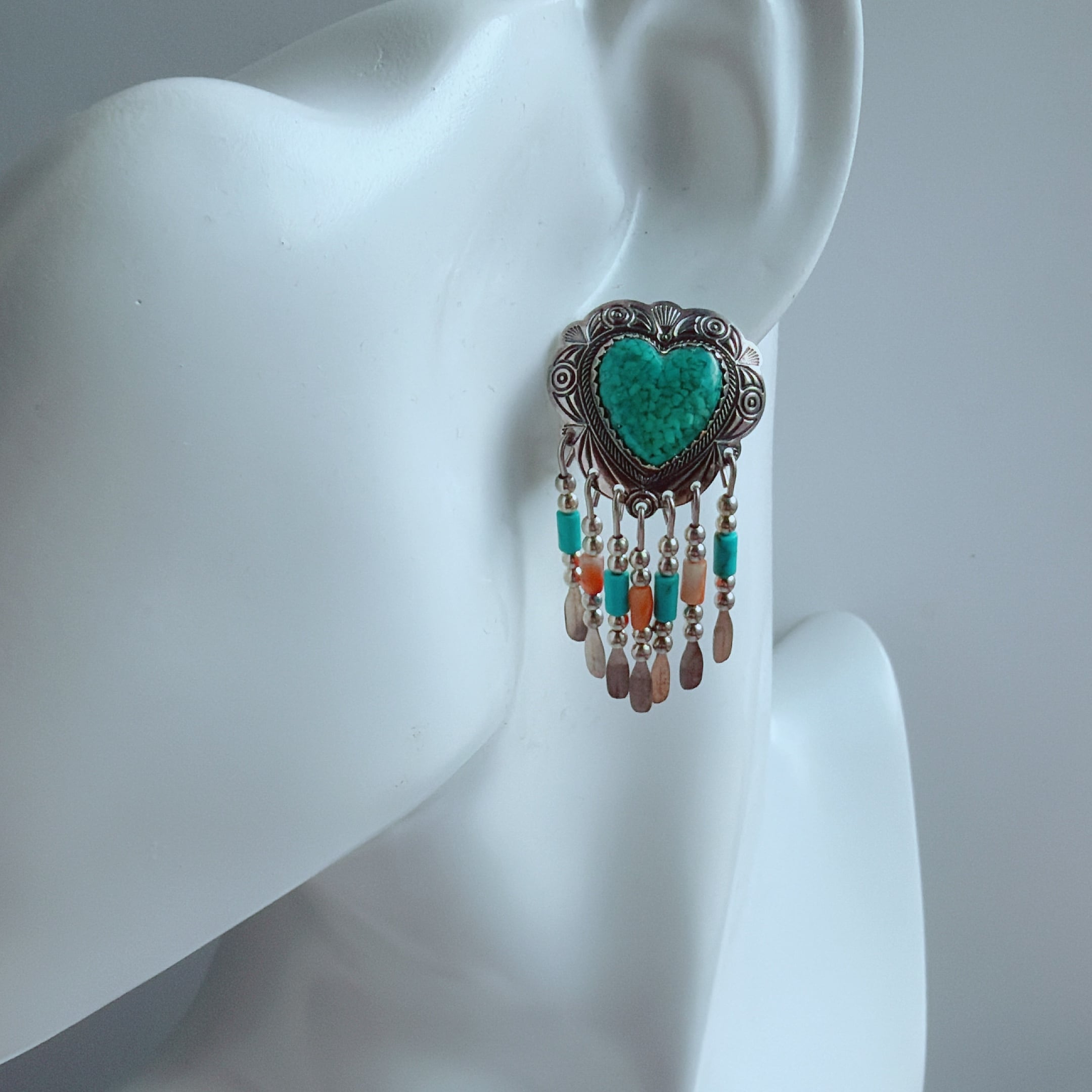 下部にはターコイズやスパイ二ーカラーのビーズ、シルバーのフリンジが動くたびに軽やかに揺れます。
