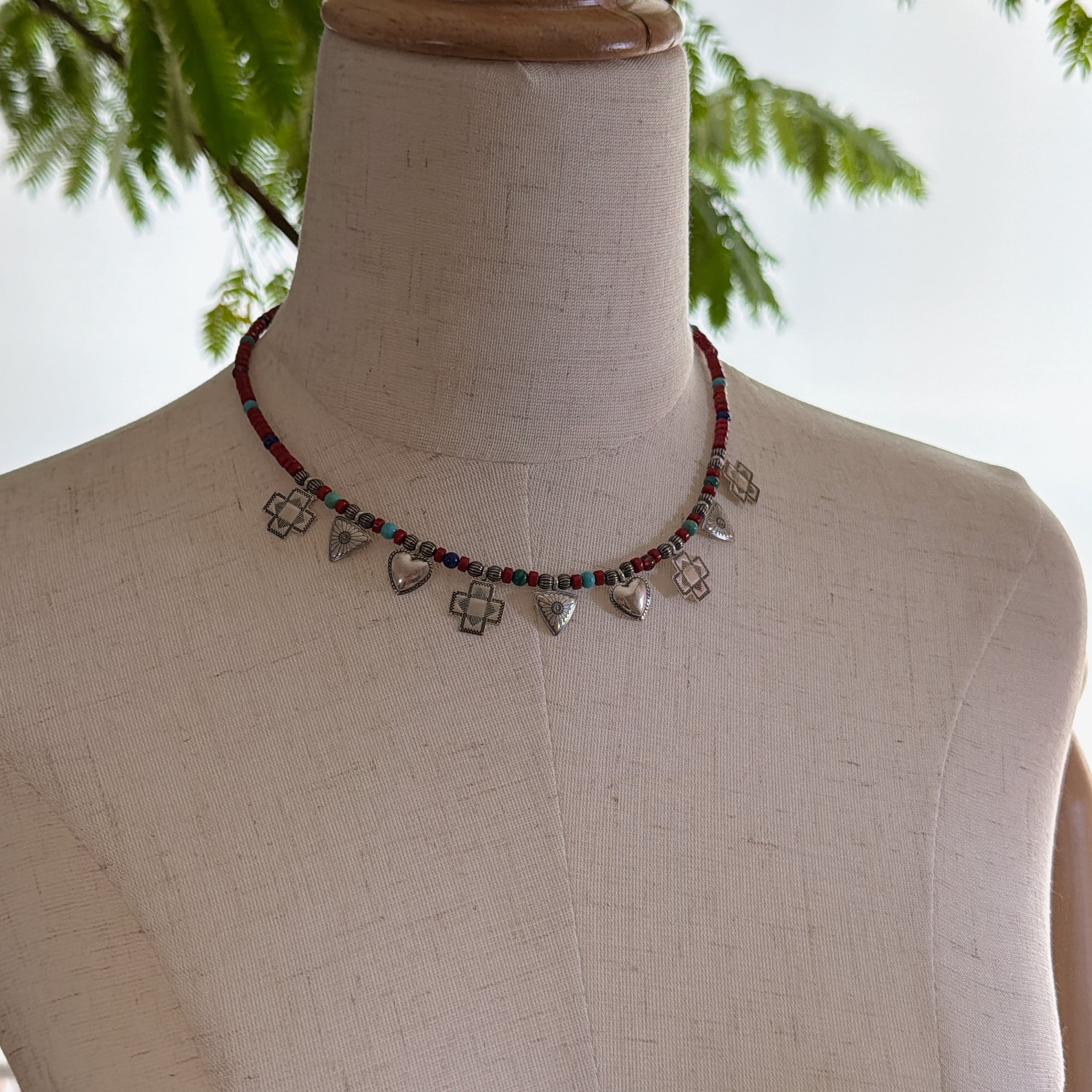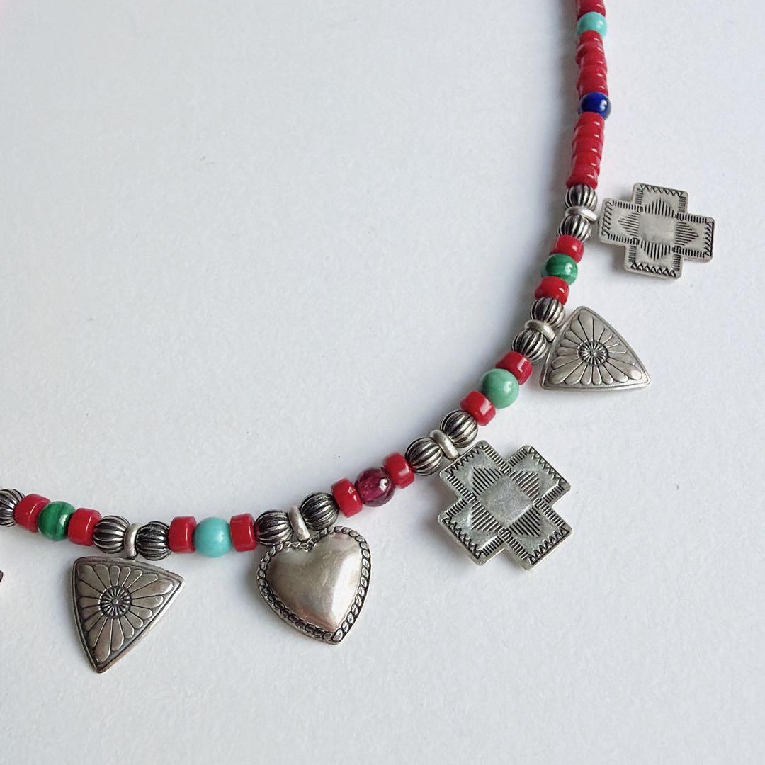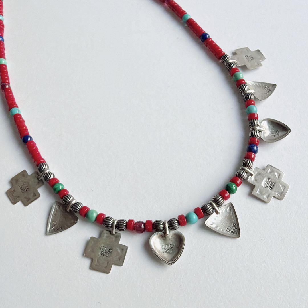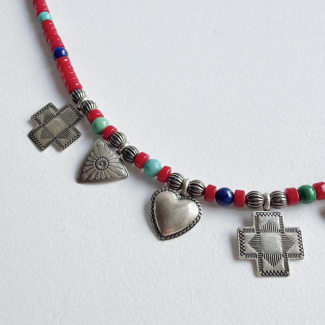 赤を基調とした小さなビーズに、スターリングシルバー製のハートとクロス、トライアングルのチャームが静かに連なります。