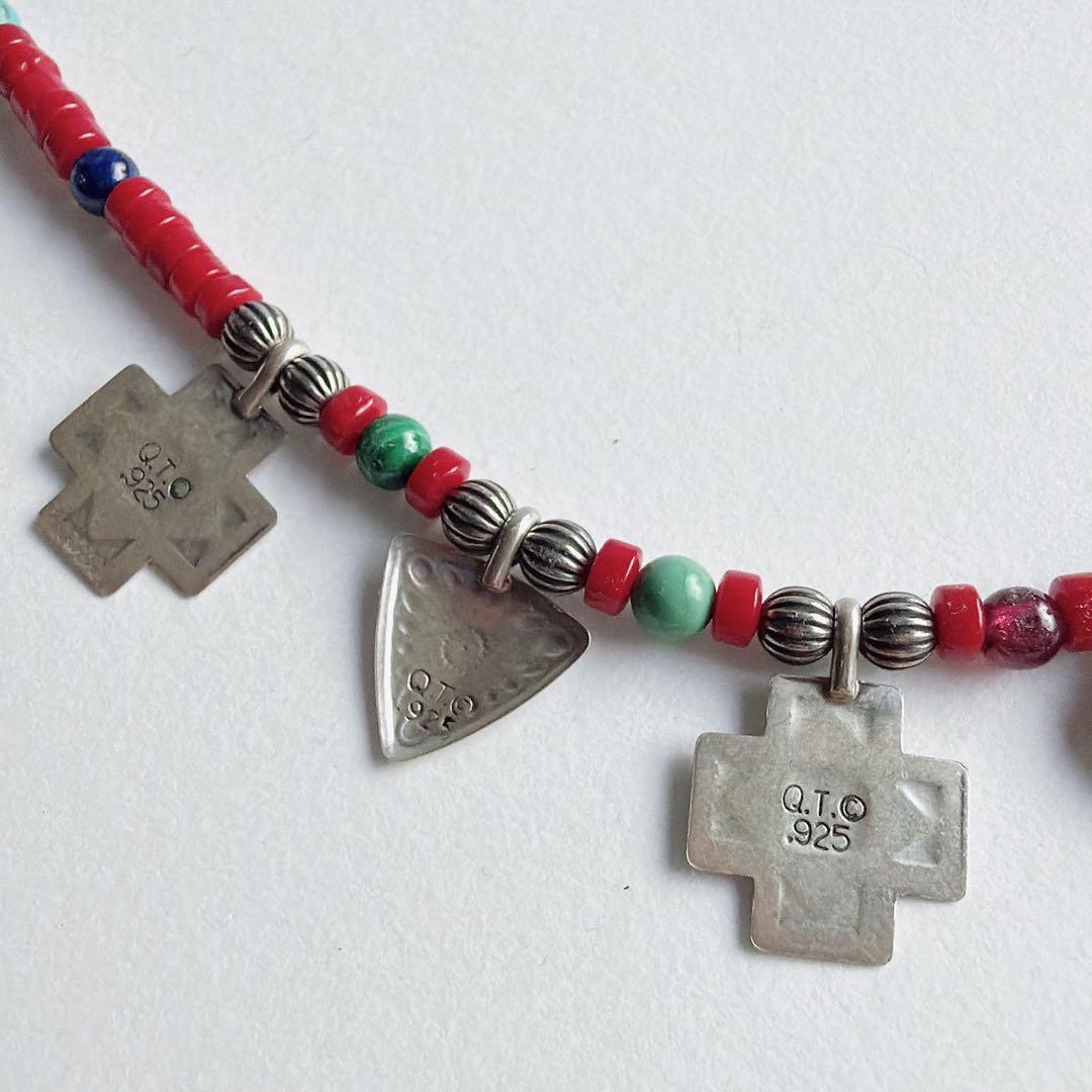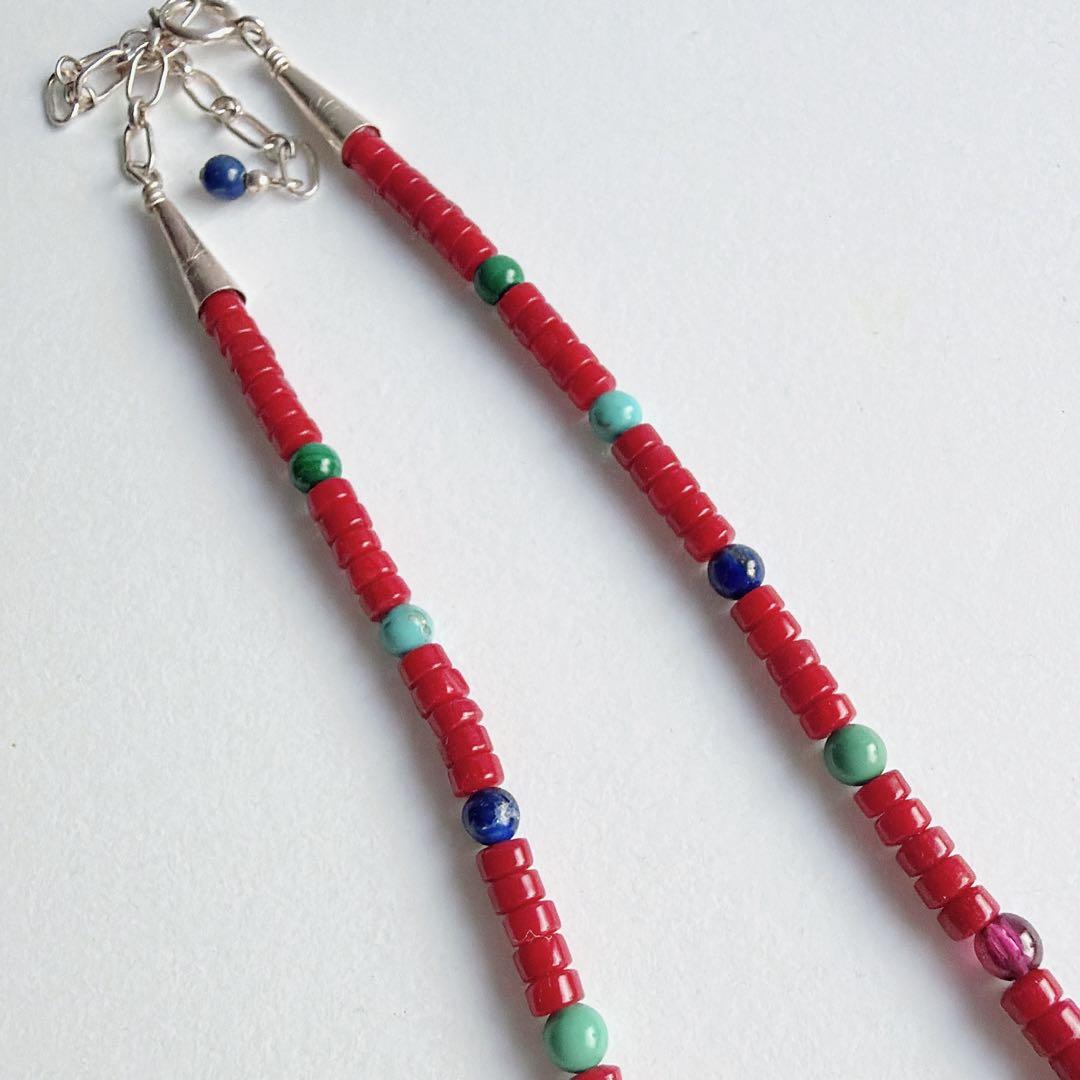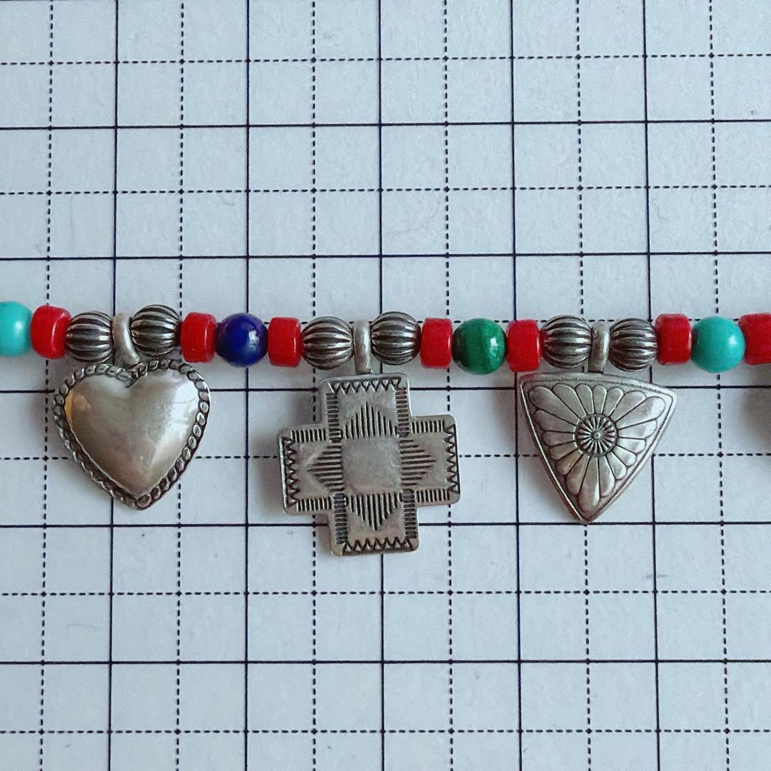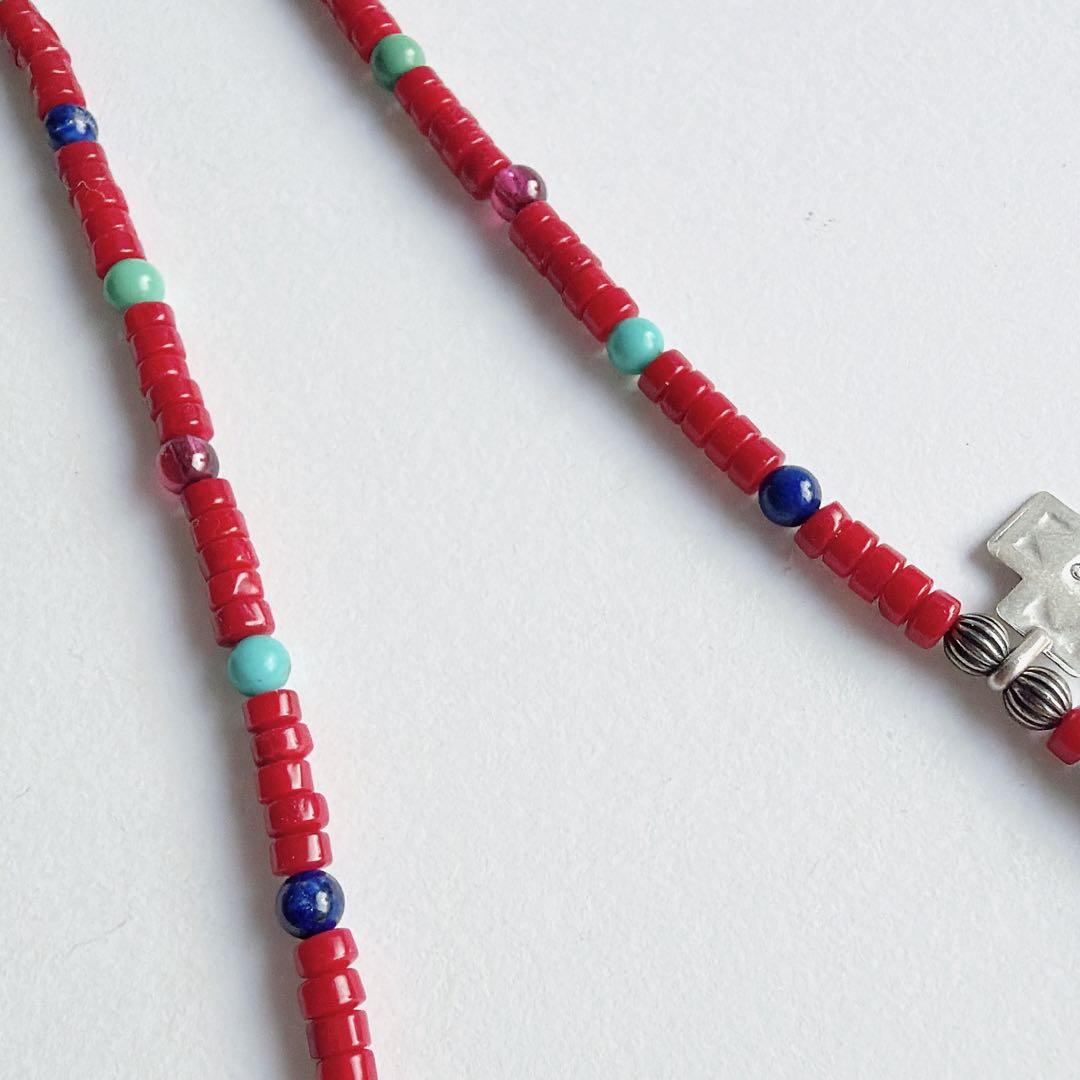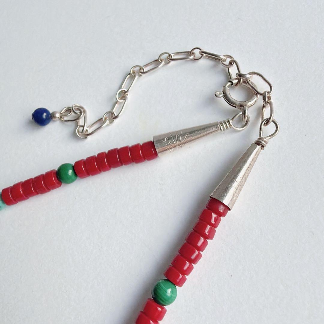 ビーズには、赤珊瑚、ターコイズ、ラピスラズリ、マラカイトが用いられ、ズニらしい色合わせが調和を生んでいます。