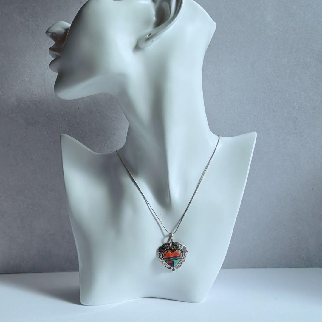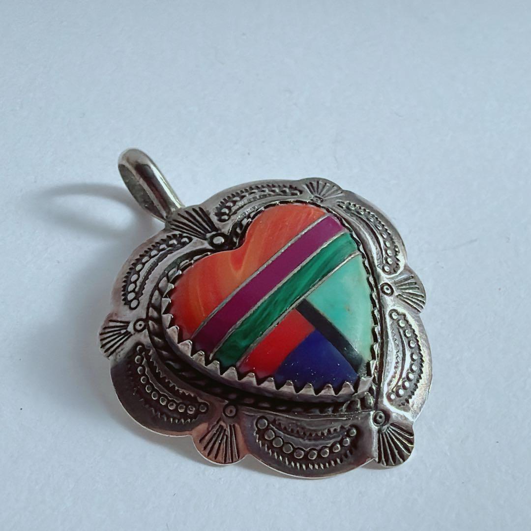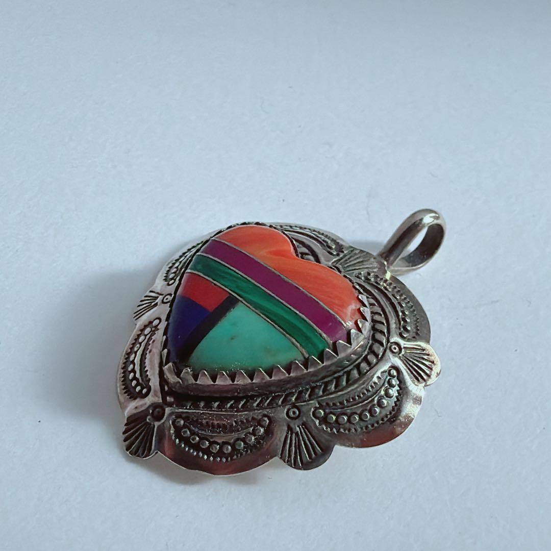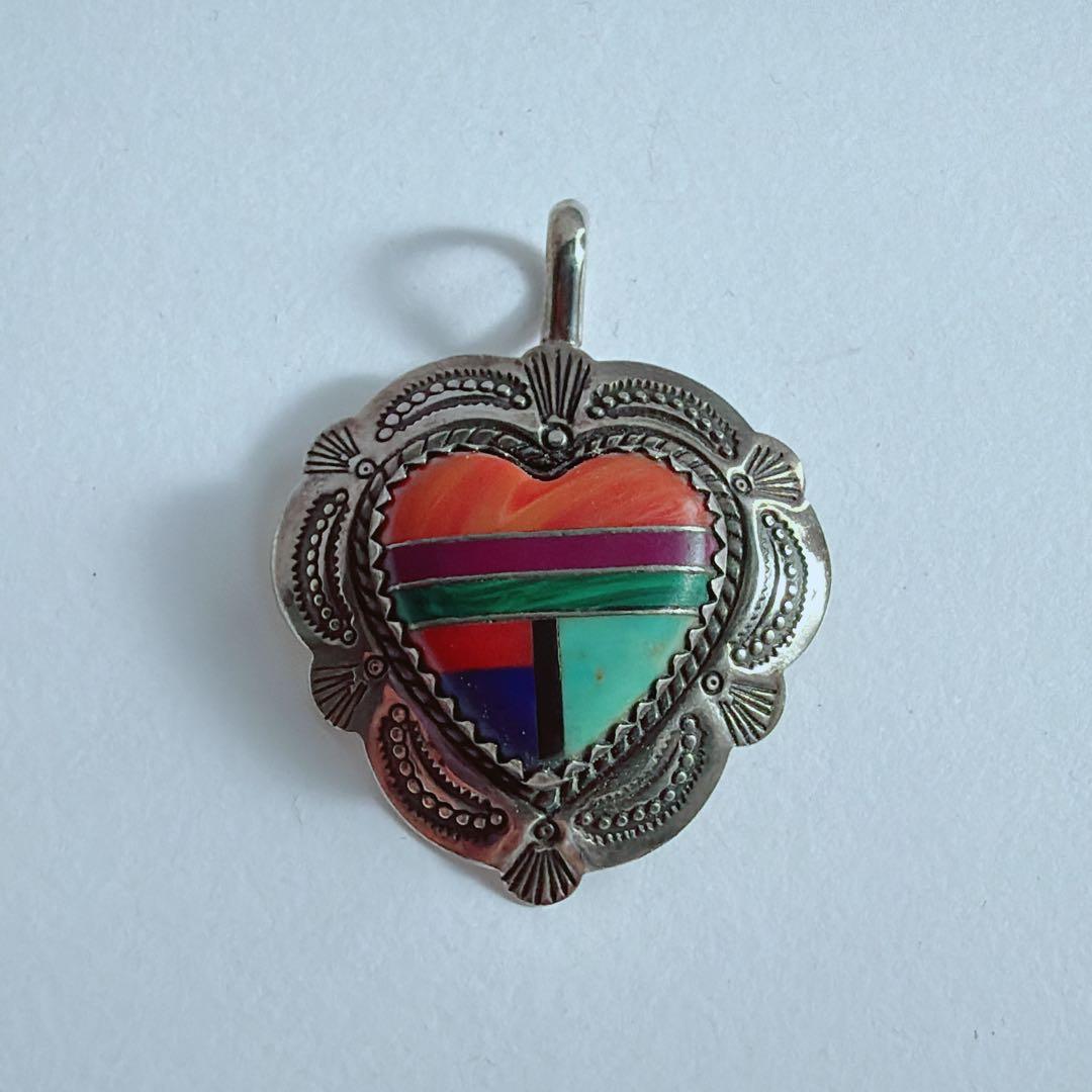 中央のハートには、ターコイズ、コーラル、オニキス、シェルなど、色味の異なる石を幾重にも組み合わせたマルチストーン・インレイが施されています。