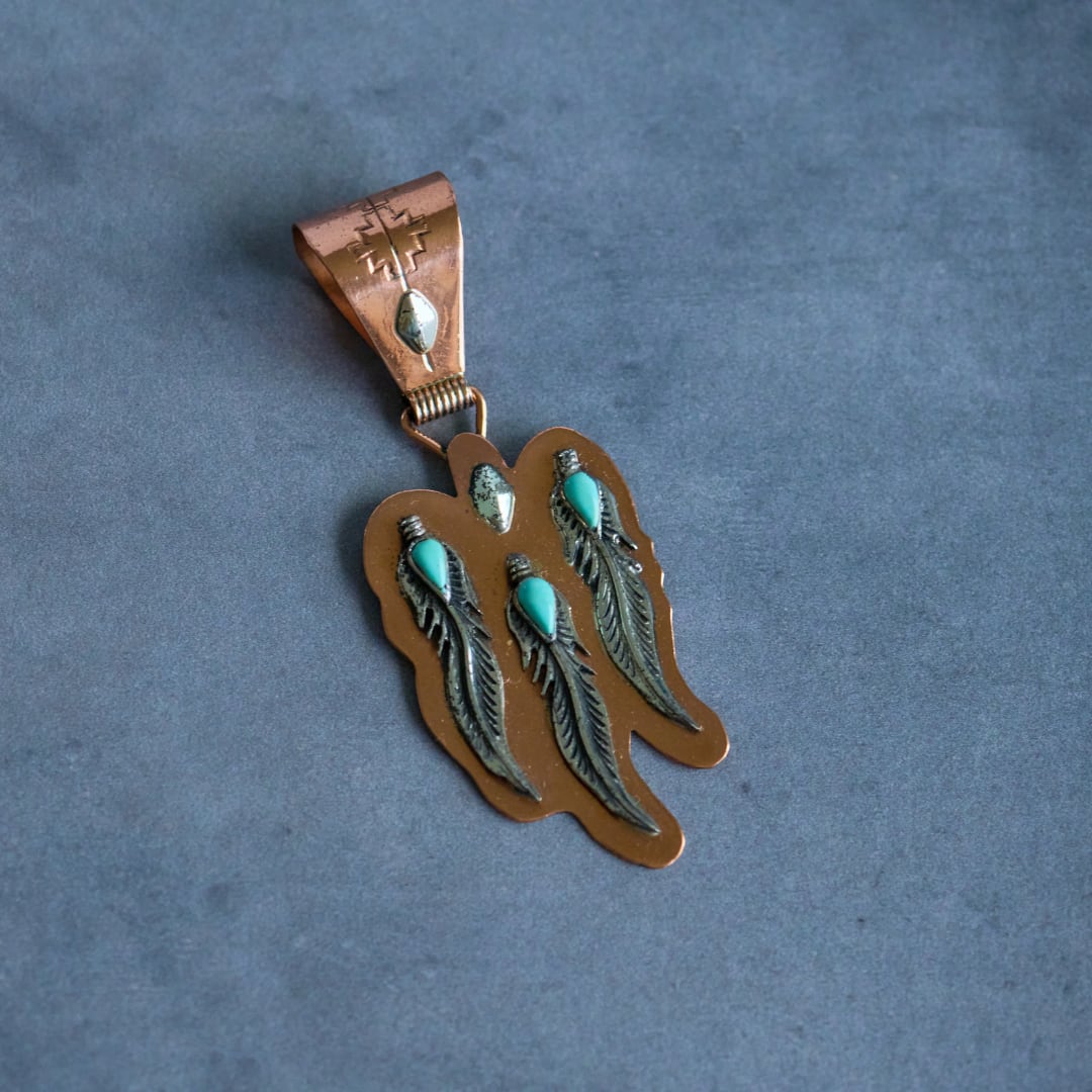 【J832】ヴィンテージ ランニングベア カッパー×シルバー ターコイズ フェザー ペンダント